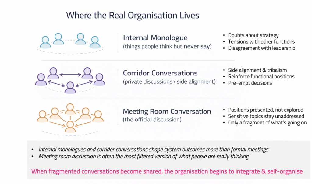 And those conversations are rarely contained within meeting rooms. They’re distributed across the organisation — some in the room, many in corridors and private exchanges, some never voiced at all. Thoughts people carry but don’t say. Frustrations that circulate privately but never surface collectively.